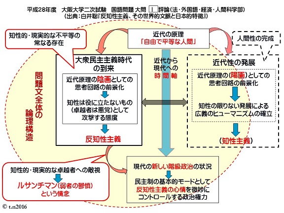 平成28年度大阪大学二次試験における評論問題(出典:白井聡氏『反知性主義、その世界的文脈と日本的特徴』)の全体の論理構造図です。キーワードは大衆の怒り「ルサンチマン」と「反知性主義」、それに関連する「階級政治」。東大の出題した同年度の評論問題も「知性主義と反知性主義」がテーマでしたから、なかなか興味深い一致です。