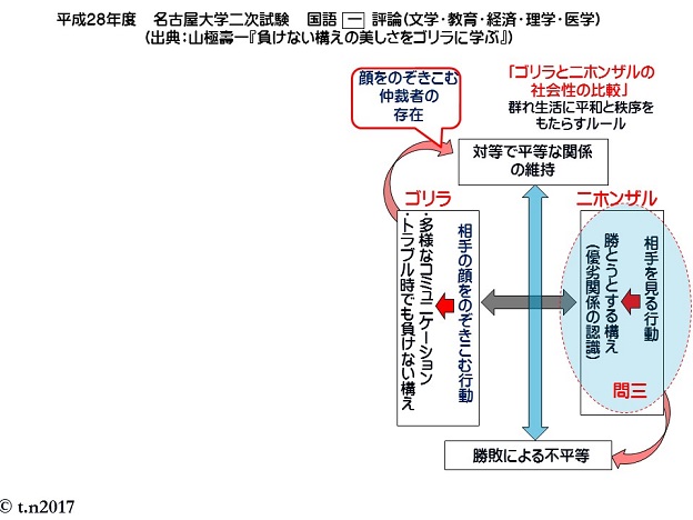 平成28年度名古屋大学二次試験(法・外国語・経済・人間科学部)の「国語」評論問題1⃣(出典:山極壽一氏『負けない構えの美しさをゴリラに学ぶ』)。山極氏はゴリラ研究の第一人者で現在、京大総長。フィールドワーカーの知見を基にした文章は、の理学部・医学部といった理系も対象した評論文として、非常に分かりやすい。同じく、理系対象に評論を出題した京大と同じく、高校の教科書でいえば高2レベルの文章である。。