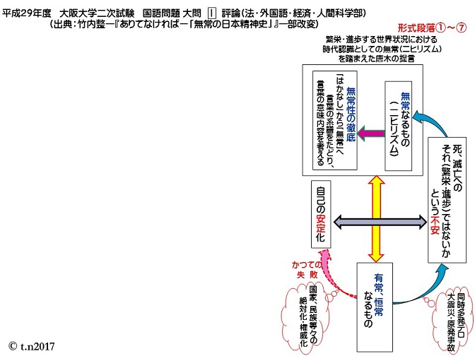 ●まず、29年度 大阪大学(文学部を除く文系学部共通)「大問一」の小問二は、「無常(はかなさ)の追求こそが、かえって生の充実(有常)につながる」というパラドックス的な発想の説明。