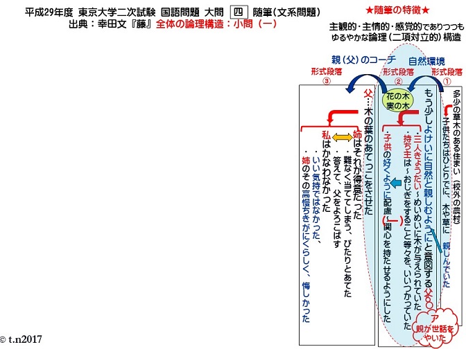 平成26年度の東大評論問題も、軸さえ確定してしまえば理解は早い。「スキーマ」をもたずに自前で論理構造を作ろうと四苦八苦するより、「評論スキーマ」を起動させてトップダウン的に評論問題を読むという習慣を今からでも身に付けることです。