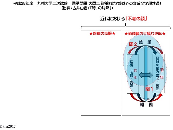 28年度の大問一といい大問二といい、全体の論理構造より「逆説」や「矛盾」といった字句にこだわる傾向が見受けられる。また、大問一の小問1と2が同じ論理構造の裏と表だったように、大問二も小問1と2が同じ論理構造の裏と表になっており、全体の論理構造から派生したような「枝問」も多い。